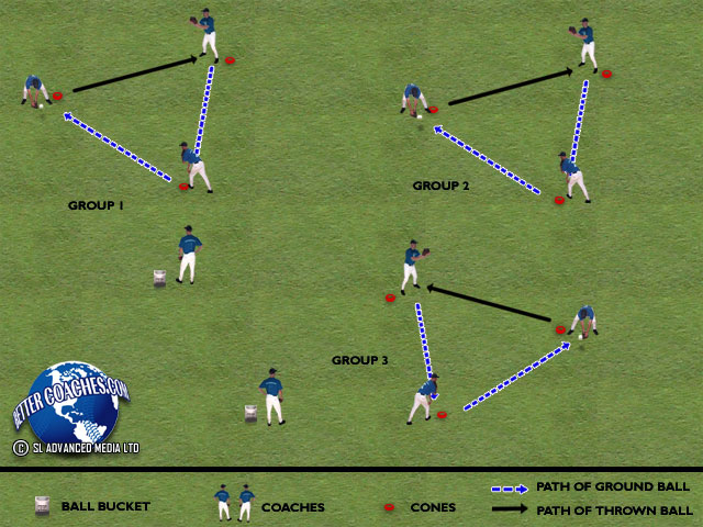 Give players an opportunity to practice picking up ground balls and throwing them to their left and right.
