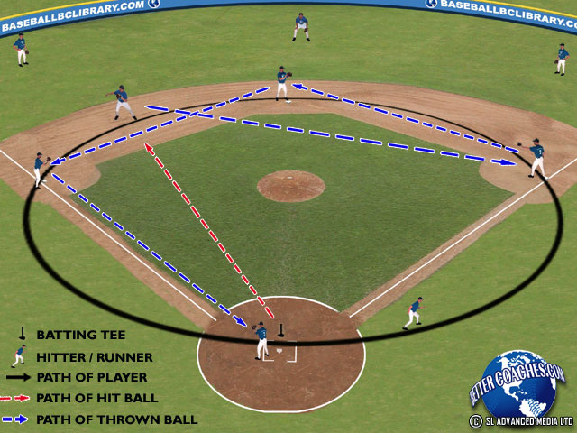 Hitters must hit a ball off a Tee then run the bases in consecutive order (first, second, third, home).